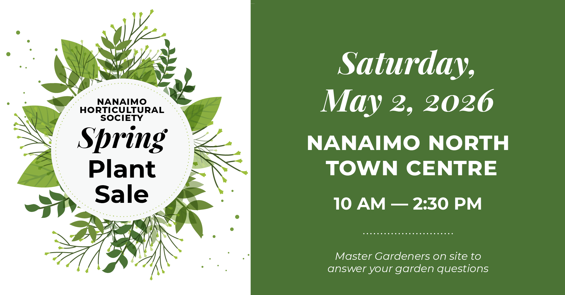 Our annual Plant Sale was held Saturday May 3, 2025 10am -2pm at Nanaimo North Town Centre. The Plant Sale was a great success. Thank you for supporting us. THANK YOU to VOLUNTEERS who donate their time, talents and plants.